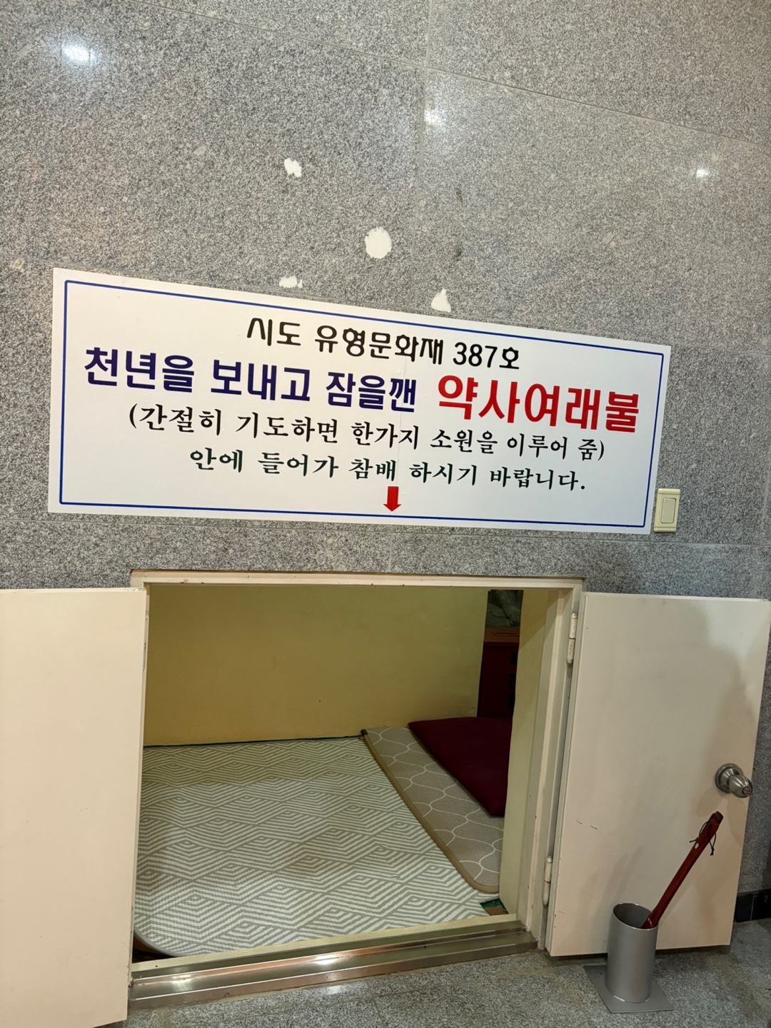 바로 **“천년을 보내고 잠을 깬 약사여래불”**이라는 안내문이 붙은 작은 공간이었어요.