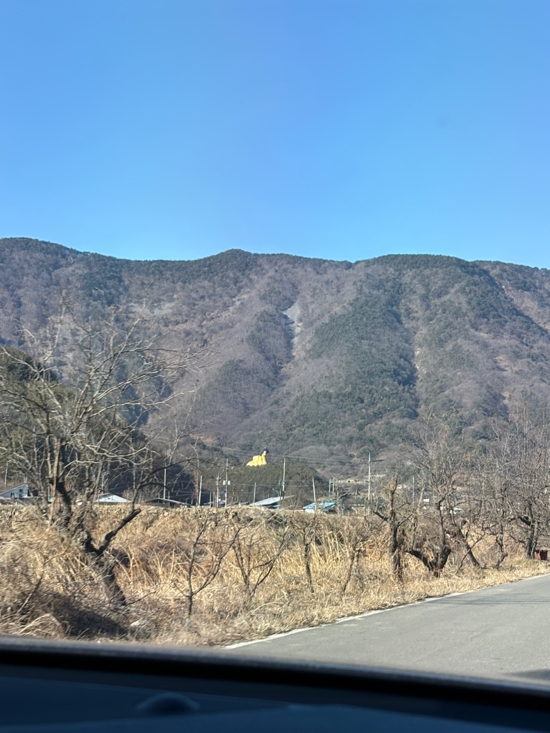햇살 아래 반짝이는 금빛 불상이 산과 하늘을 배경으로 누워 있는 모습은